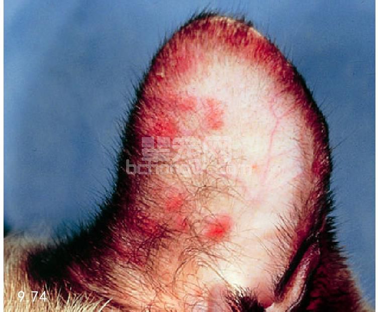 图9.74 肥大细胞瘤引起1岁的暹罗猫耳廓部出现红疹和结节。