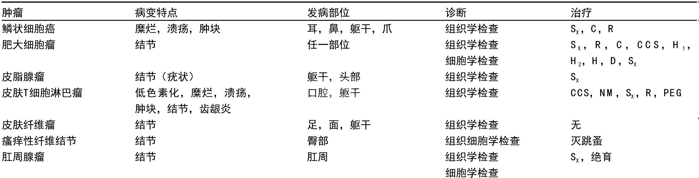 诊断 压片或吸入涂片进行观察可进行试验性诊断。肿瘤和组织细胞肥大细胞不含具有鉴定意义的颗粒,组 织学检查是必要的(表9.5)。MCT有时可能易与其他圆形细胞瘤或嗜酸性血小板相混淆。特殊的染色法可以对 某些小染色颗粒异染,但还需使用组织化学标记物来识别才能确诊。