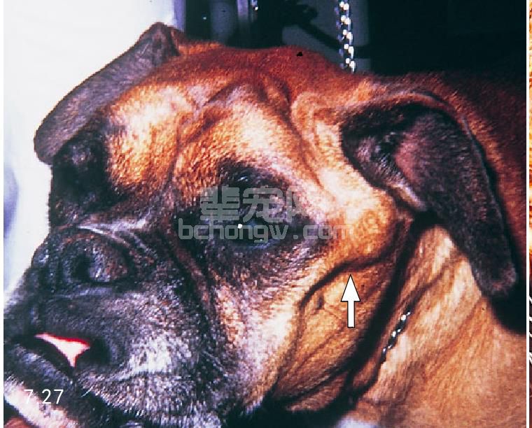 图7.27 肿瘤引起犬单侧三叉神经麻痹:咀嚼肌消瘦,颧弓突出(箭头所指)。