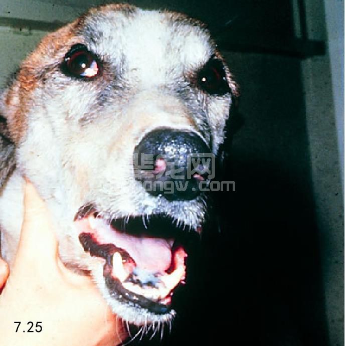 临床症状 口张开,不能采食,但若只有第Ⅴ脑神经受损,能吞咽(图7.25)。动物把鼻子深没入水中喝水 (图7.26)。很快发生肌肉萎缩(图7.27); 然而,患犬常在3~16周恢复。