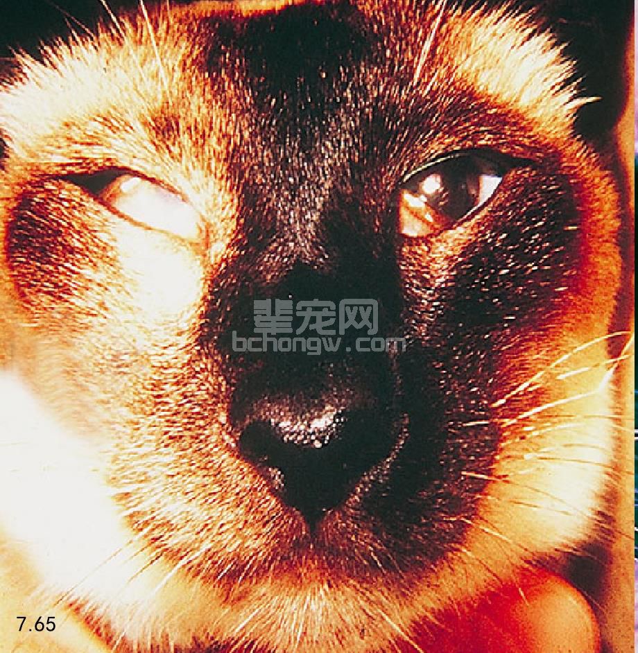 图7.65 暹罗猫的霍纳氏综合征,4周前被猫咬伤神经,动物表现瞬膜下垂、脱出,右面脸色改变。