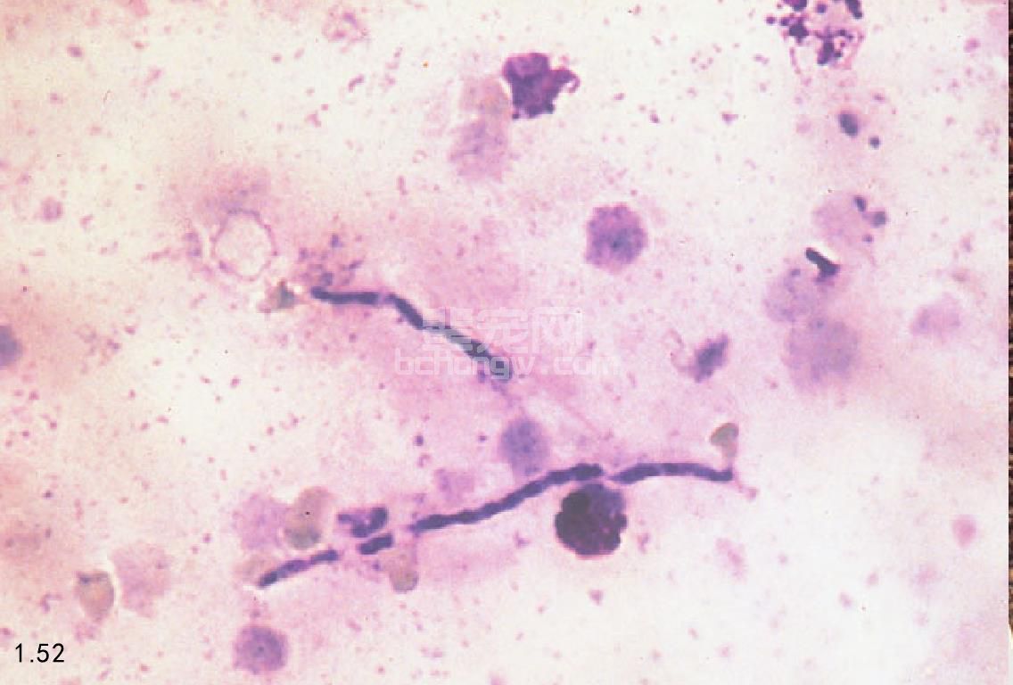 图1.52 这是被土曲霉菌感染的德国牧羊犬,尿沉渣检查可见真菌菌丝。