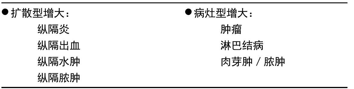 扩散型和病灶型胸腔纵隔增大 前部纵隔肿块的X线影像特征包括前部纵隔宽度增加,心脏后部移位,气管 提升和偏离,肺前叶后方移位(图2.44)。前部纵隔肿块进行超声波检查易成像,传感器从前部移动到心脏,硬 组织的回声图像比正常肺的干涉图更易看到。前部纵隔肿块超声波检查时,表现不确定。淋巴瘤的次回声和无 血管性具有相似性常不能确定(图2.48)。其他组织学类型的肿块在回声反应、构造及血管供应方面具有可变 性。不规则的无回声区是出血或坏死区,而明亮的回声区域则表示纤维化或钙化。进行组织学诊断,可穿刺或 活检。