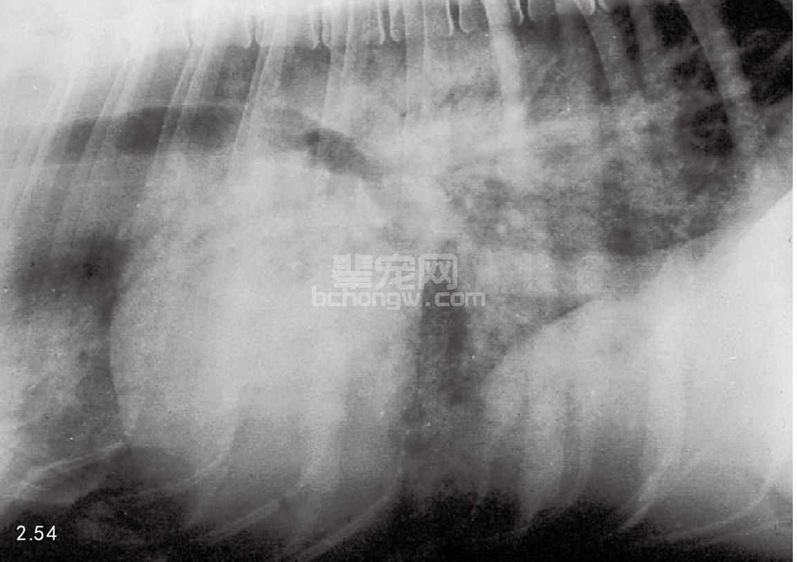图2.54 患慢性肺水肿的7岁杜宾犬的侧面胸腔X线片:腹部和肺门周围肺泡不透明分布。