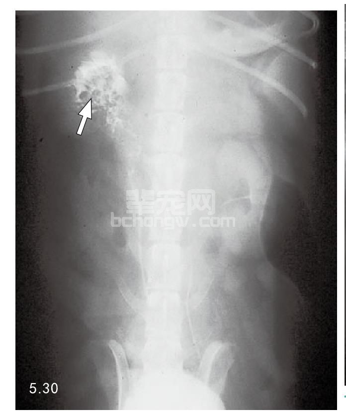 诊断 犬的肾脏肿瘤,腹部X线片显示有不规则增大的肾脏并能看到矿化区域。肾X线尿路造影见图5.29。 显示肾脏感染部位异常血管灌注,肾盂造影图像可以显示收集系统的变形(图5.30)。超声波可以检测恶化组织 的异常回声(图5.31)。肾脏团块的直径大于5cm很可能是肾脏肿瘤。血尿持续存在,可利用膀胱镜检查病变的 肾脏输尿管以显示出血部位(图5.32)。尿液细胞学评价并不可靠,只有切除的肾脏活组织检查才能确诊。犬和 猫的淋巴瘤、针管抽吸或活组织检查可确诊。放射学检查可确定是否转移。