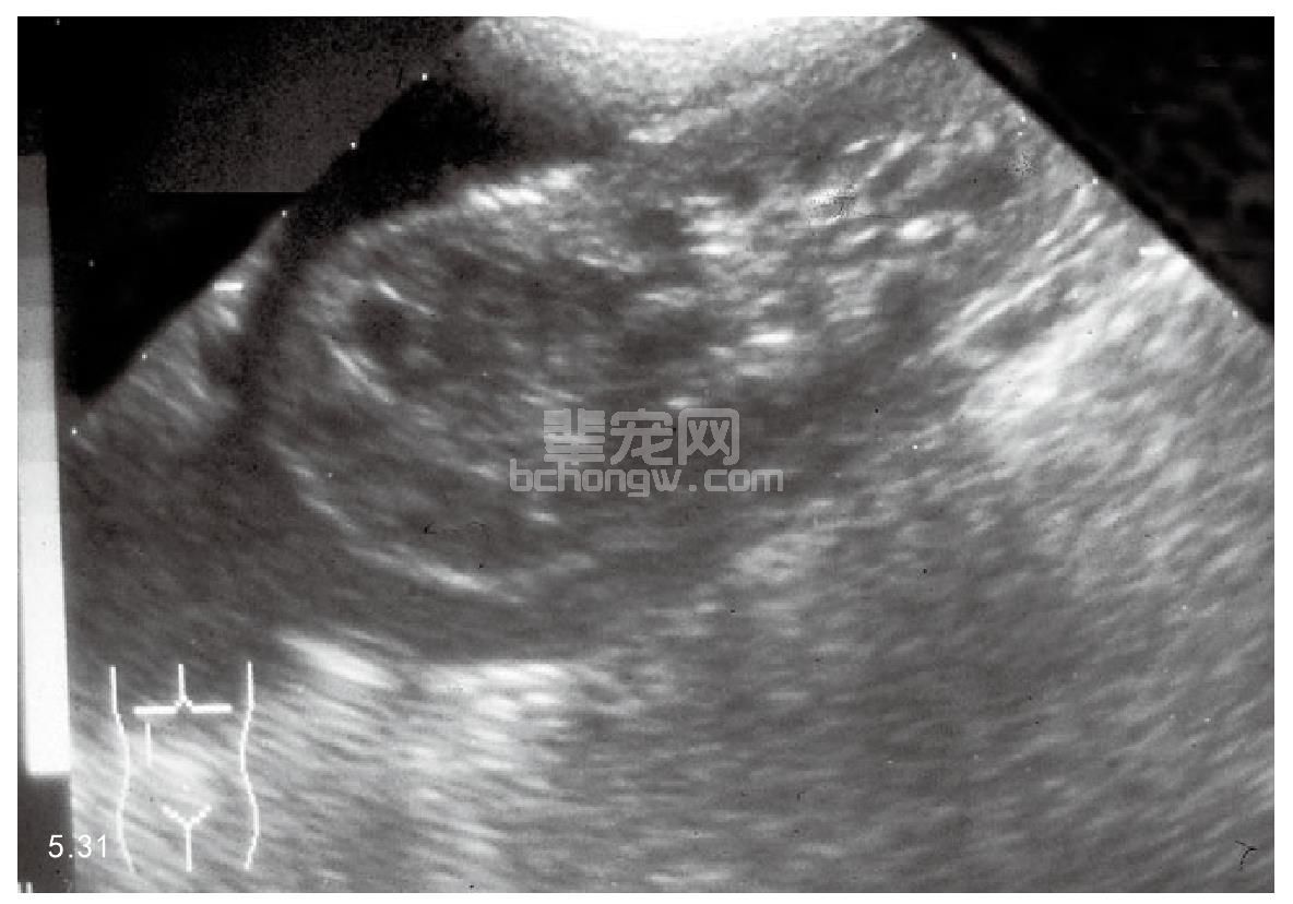 图5.32 膀胱镜检查患有单侧肾脏肿瘤的患犬血液从输尿管中流入膀胱。