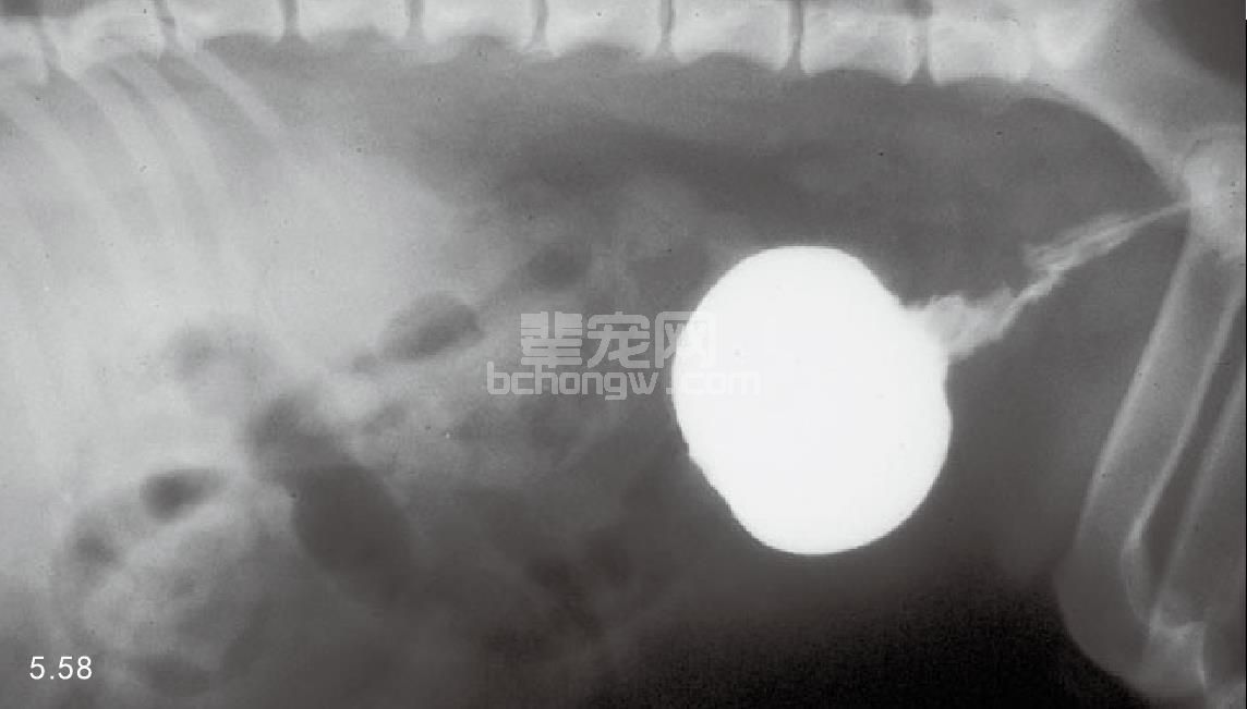图5.58 犬前列腺腺癌侵占尿道的逆行性尿道造影。造影剂膜表面粗糙、不规则。