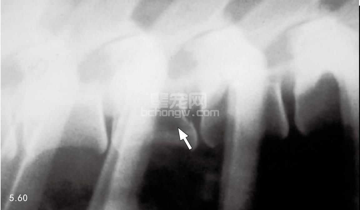 图5.59~图5.61 犬转移性前列腺腺癌的颈椎和胸椎的X线片和闪烁扫描图。图5.59颈椎椎体透射线区域(箭头所指)。图5.60胸椎椎体X射线区域(箭 头所指)。图5.61对同一只犬做的闪烁扫描,显示的“热点”为转移部位。