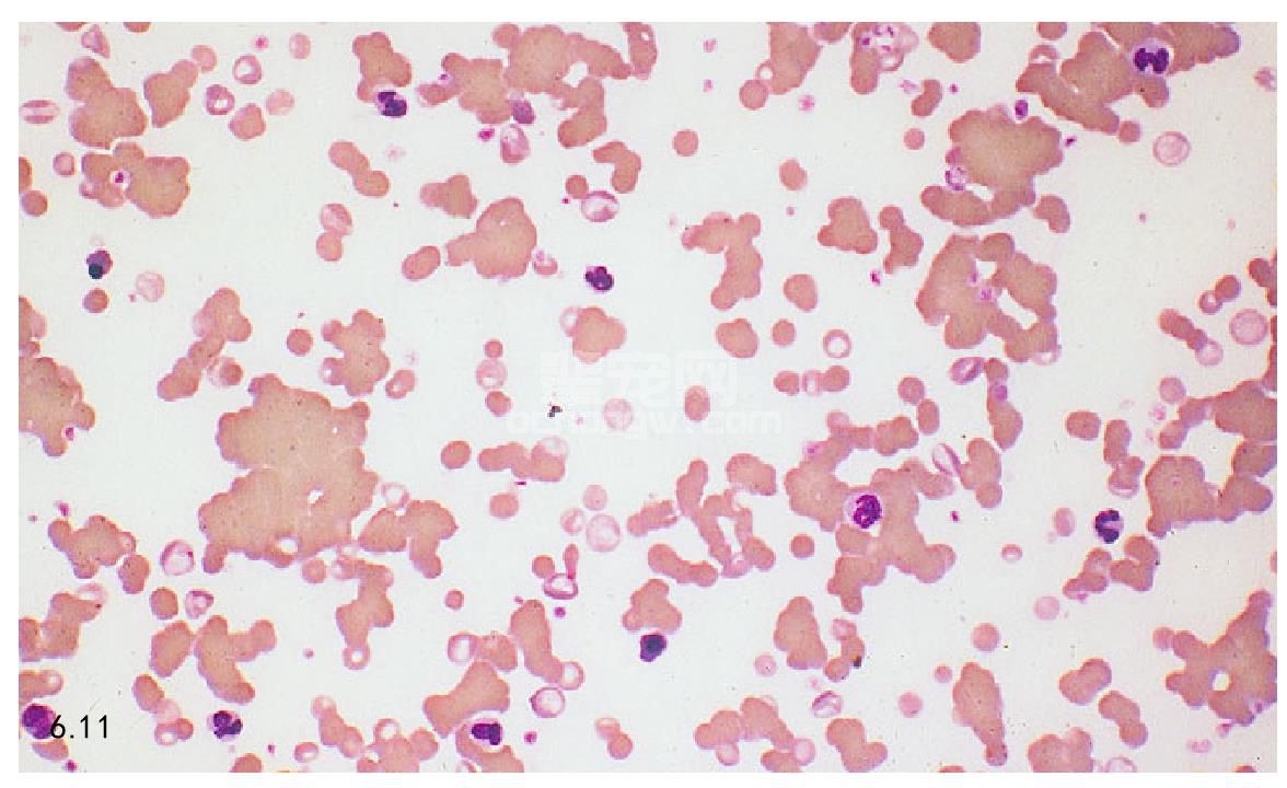 图6.11 血涂片显示红细胞大量凝集。