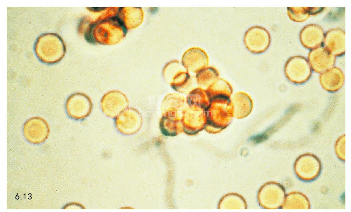 图6.13 血液标本说明有与真正的凝集相对应的致密红细胞团。