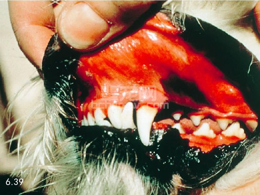 图6.39 患红细胞增多症犬的暗红色齿龈。