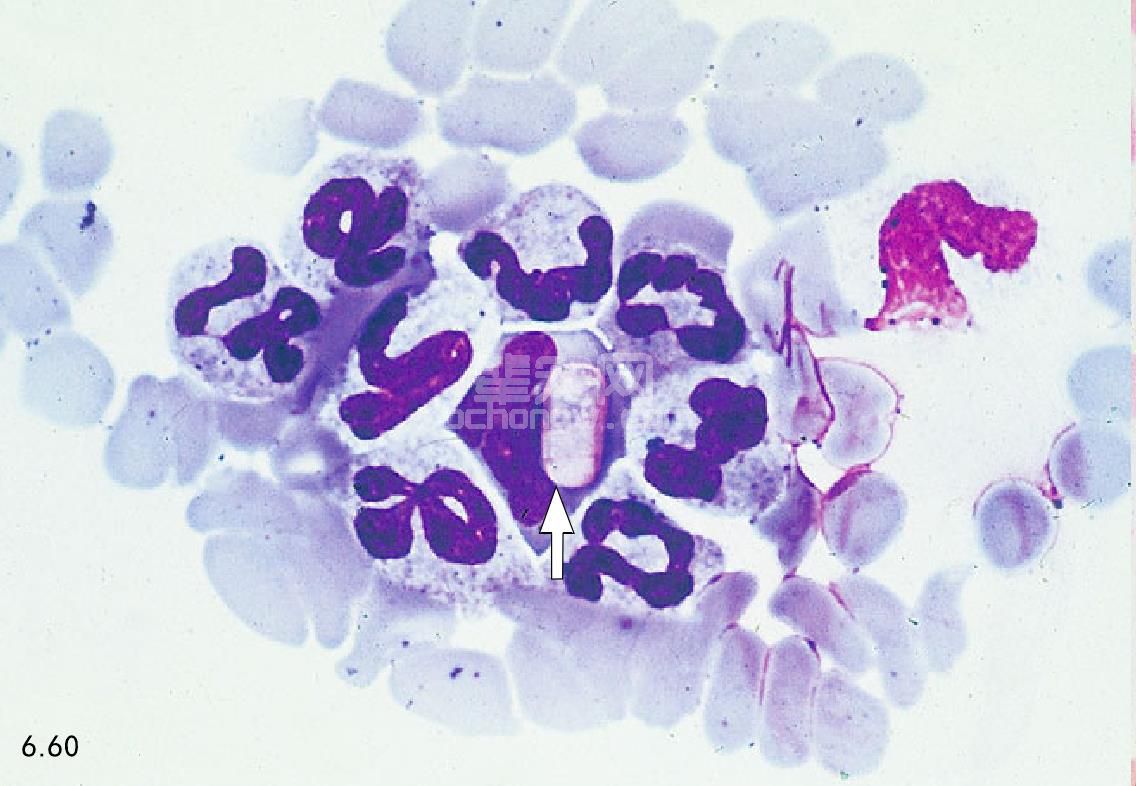 图6.60 犬肝孢子(簇)虫病(Hepatozoonosis)的血液涂片:单核细胞 中长椭圆形亮蓝色结构(箭头所指)。