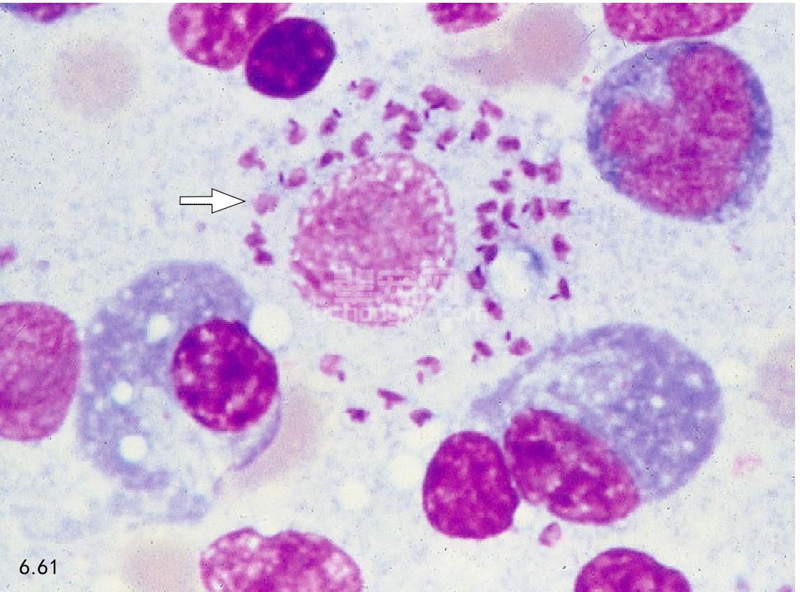 图6.61 感染利什曼原虫(Leishmania spp.)犬的骨髓涂片:可见巨噬 细胞胞核(箭头所指)内无鞭毛体存在。