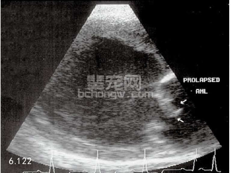 图6.121和图6.122 1岁骑士查理王猎犬的超声波心动描记,该犬患心内膜病且二尖瓣下垂入左心房。